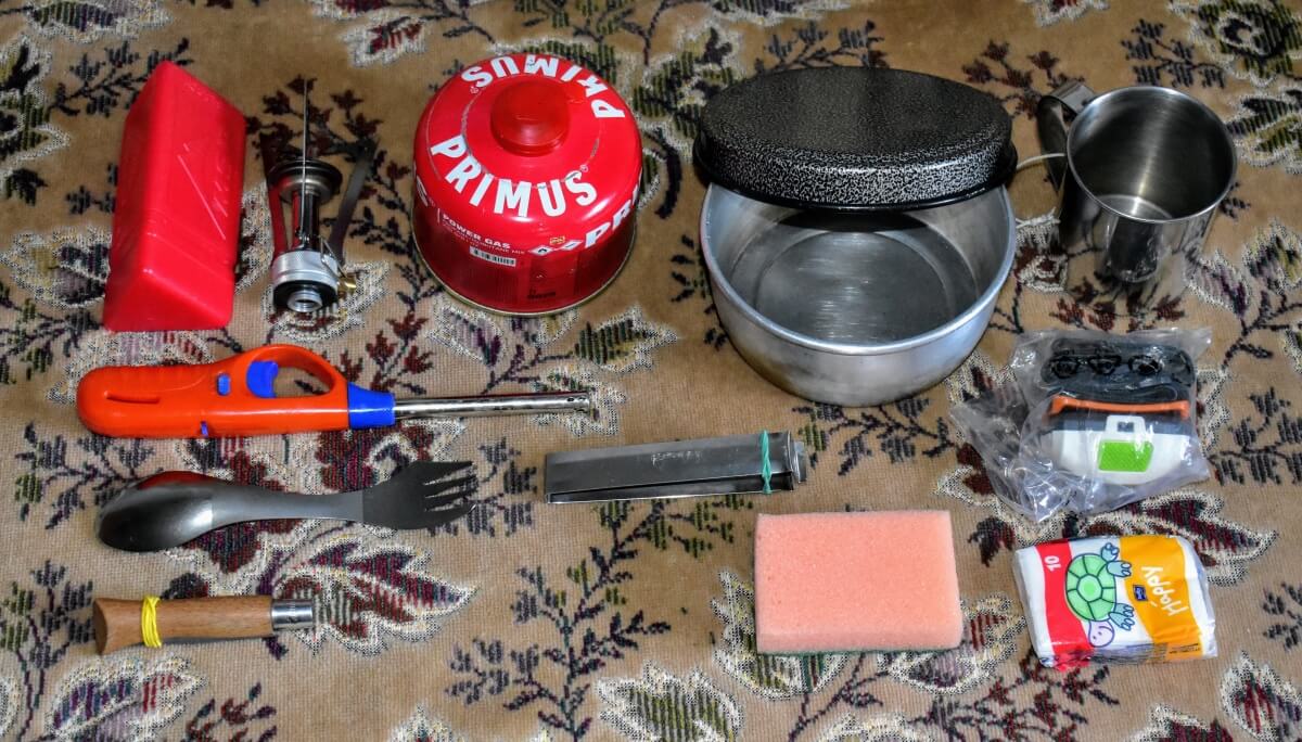 - Kitchen — stove, fuel, lighter; spork, knife, mug, pot; headlamp, sponge, tissues; food (detailed below);
