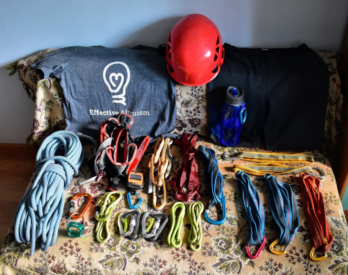 If you rock-climb instead, you may probably replace the semi-static rope and some of the other items by a longer length of thinner dynamic rope plus a handful of quick-draws for the sport routes along your way, while remaining at about the same weight and volume.