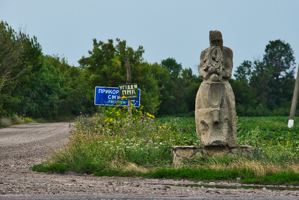 In every settlement there were Cossack sculptures decorating the entrance as well — sometimes the sculptures were right next to the location marker itself, sometimes they were across the road from the markers. (Myhailivka)