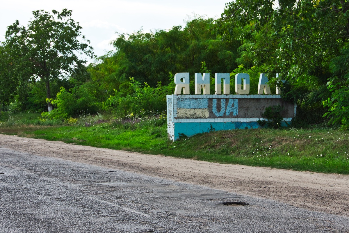 and a few of you might have noticed that the town name is spelled in Russian — another contrast to the patriotic connotation of the other markers in the district, and possibly what prompted whoever drew the Ukrainian flag on this one on our way out of Yampil’.