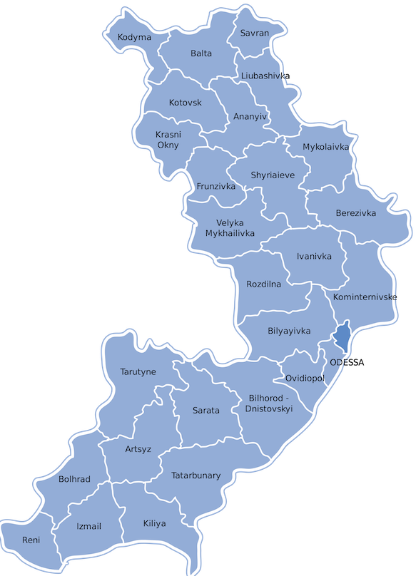 If you like to follow stories that unfold across a geographical area on a map, i hope these two will help — the left one highlights the administrative region of Odesa, and the right one names its districts (click to enlarge).