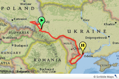 a rough outline of our route from Stryi to Odesa, by means of Poland, then back to Ukraine through the administrative regions of L’viv, Ivano-Frankivs’k, Chernivtsi, Vinnytsia, and Odesa (image courtesy of Scribble Maps)